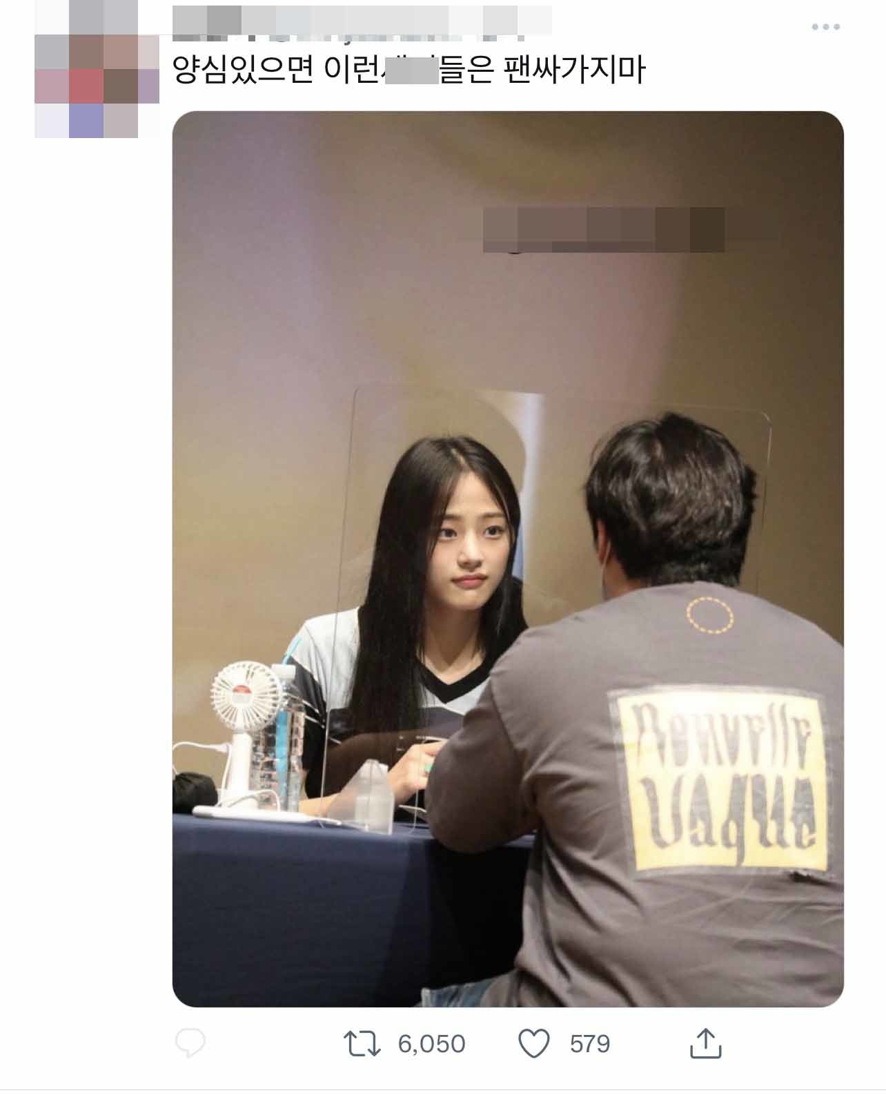 據了解當日簽售會只來了兩名男粉絲,然後就被偷拍放網上公審,個人身份被肉搜公開。令人咋舌的言論,被網友罵翻,「男粉也是堂堂正正地以粉絲的心買唱片,中了粉絲簽名會才去應援的」、「那個人做錯什麼了」、「用外表來評判人真的很噁心」、「我現在都不敢當粉絲了」、「去粉絲活動也要看顏值嗎」。