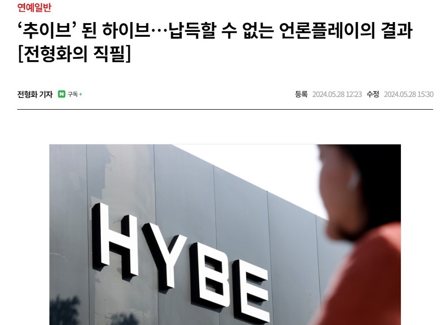 《日刊體育》記者田衡華(音:전형화 )發表題為「變成『CHUIBE』的 HYBE …難以理解的媒體炒作的結果」的採訪後記,文章指出 HYBE 第一天就大張旗鼓宣佈監察行動,但正常情況都是內部安靜地調查,直到有結果才對外公開,質疑這種做法究竟是想讓解僱閔熙珍,還是對她社會性的埋葬。關於最初三天的看似韓媒集體攻擊閔熙珍,記者揭露他們是收到 HYBE 公關資料才報導。(CHUIBE:추이브 = 추하다(醜惡) + HYBE )