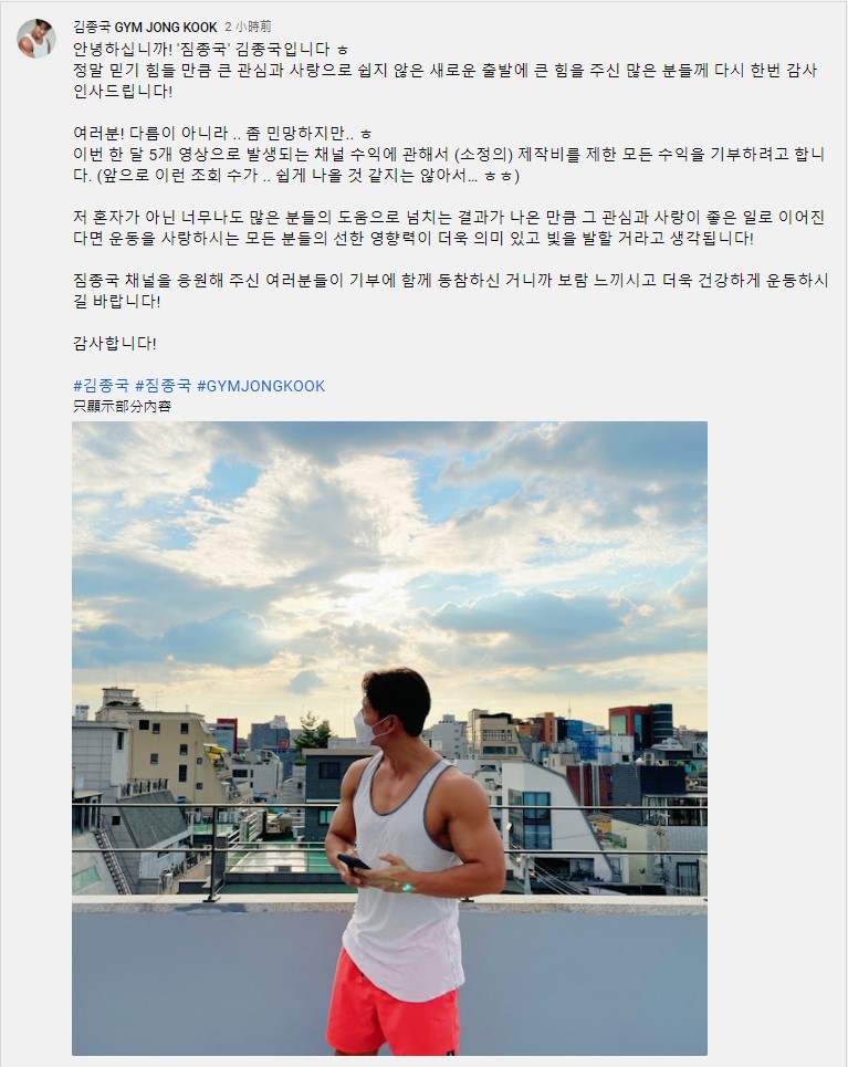 而在今 (21) 日金鍾國通過 YouTube 社群宣佈,把 7 月份 5 部影片的收益扣除製作成本後,全數捐出幫助更多有需要的人。