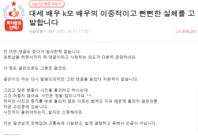 圍繞演員 K 某的文章真僞,被網友敦促公開證據。 PO 主隔日再發文回應。她說:「多人讓我上傳照片,但這並不難,照片真的很多」,「只是因爲法律原因沒有上傳照片和證據,現在正在苦惱中」。