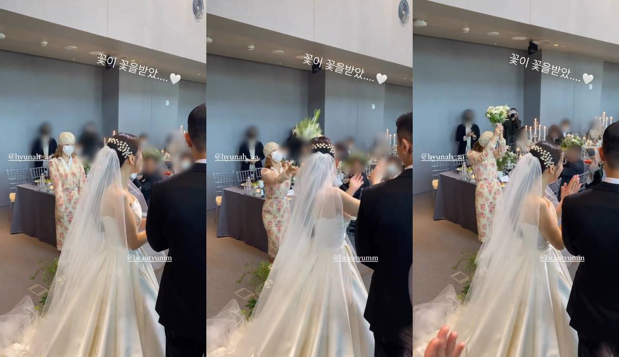 造型師金智慧(김지혜)在限時動態 PO 出泫雅接到捧花的影片。片中泫雅身穿碎花洋裝出席另一位造型師嚴雅凜婚禮。 只見她接到新娘的捧花後,讓她又驚又喜,開心地眯着眼笑。