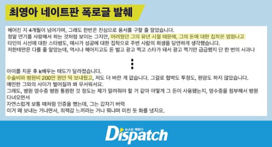 2021 年 1 月 11 日, Dispatch 收到了舉報郵件。裡面有崔英雅和前夫,兩人的離婚原因,還有金宣虎的故事。