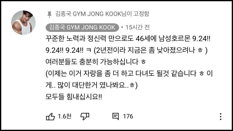 金鍾國在昨日最新發布的 YouTube 影片中留言,他提到自己過去出演 SBS 綜藝《我家的熊孩子》時測量男性荷爾蒙數值的結果,他表示,憑藉不懈的努力和精神力,46 歲的男性荷爾蒙數值達到了 9.24,大家也可以做到。 現在好像可以多炫耀一下這個了,這個好像是很了不起的事。反駁該 YouTuber 的講法。