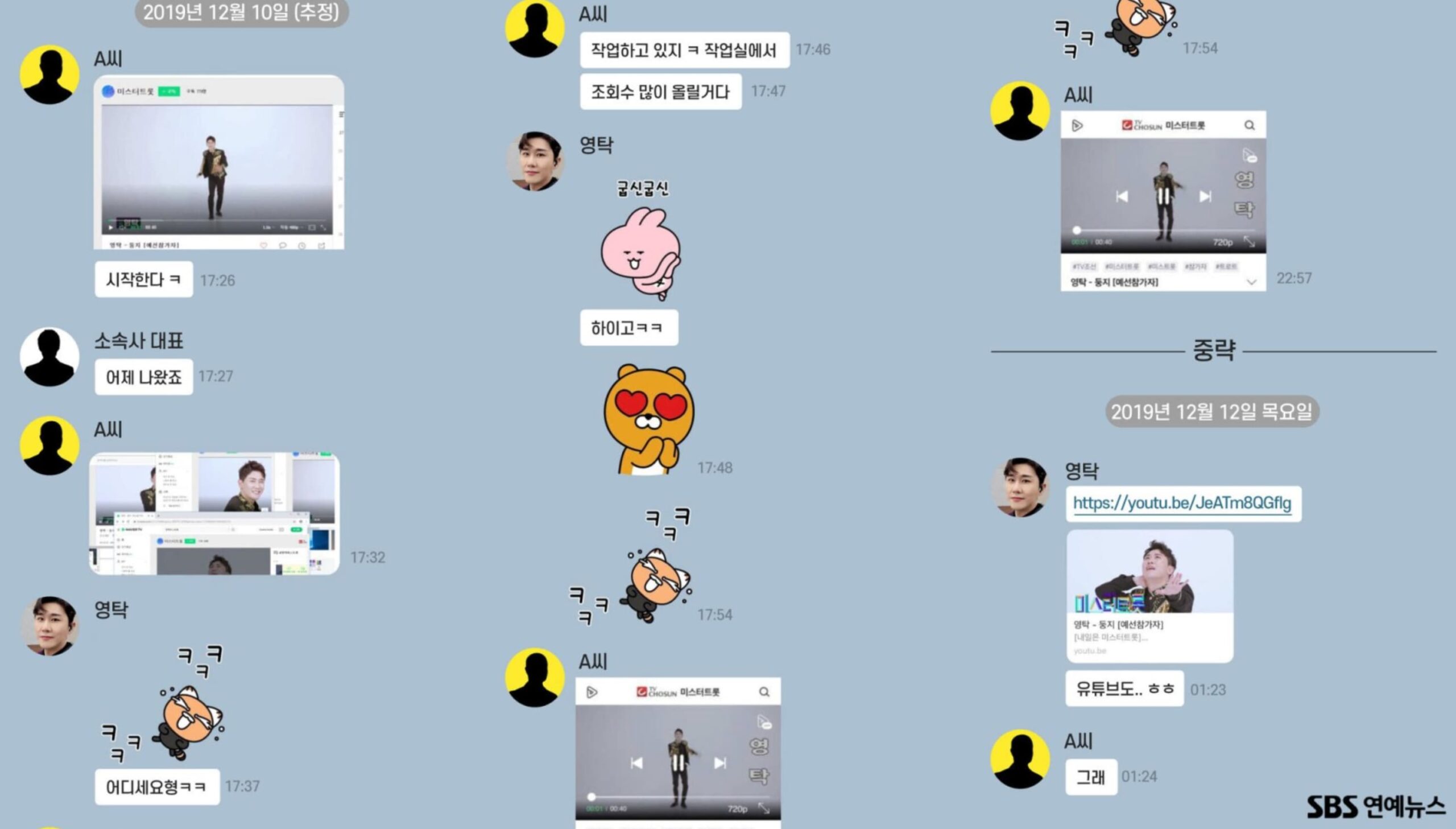 2019 年 12 月 10 日,A 某將永卓參與《Mr.Trot》預賽的影片截圖上傳到聊天群,永卓拜託的同時也發出微笑的表情。