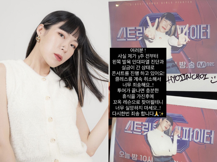 HYOJIN CHOI 在 IG 限時動態上表示,其實我從 3 周前開始就在診斷左腳踝韌帶撕裂,一直在失禁的狀態下進行巡演。她對一直在取消課堂感到抱歉。在巡演結束後,會充分休息,然後上課和大家見面,希望大家不要失望。
