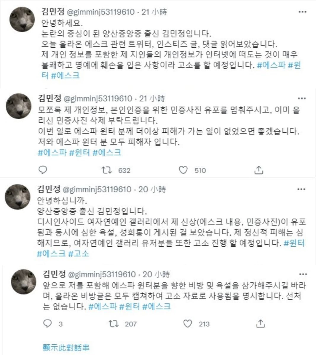 還警告,「雖然不知道是誰偷走我的文章,但是我的個人信息正在傳播,而且正在發生性騷擾和名譽毀損的情況,所以會採取法律措施」。