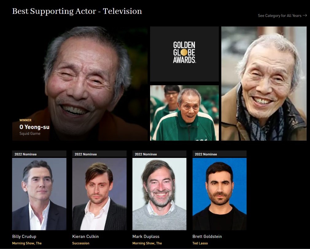 第 79 屆金球獎星光不再,因早前被爆出一系醜聞,今年演員、電影公司、電視台繼續抵制,得獎名單只能透過官網宣布。而去年爆紅的劇集《魷魚遊戲》,劇中那位「001」號老爺爺吳永秀收獲電視類別「最佳男配角」,成為韓國首位演員奪得此獎。