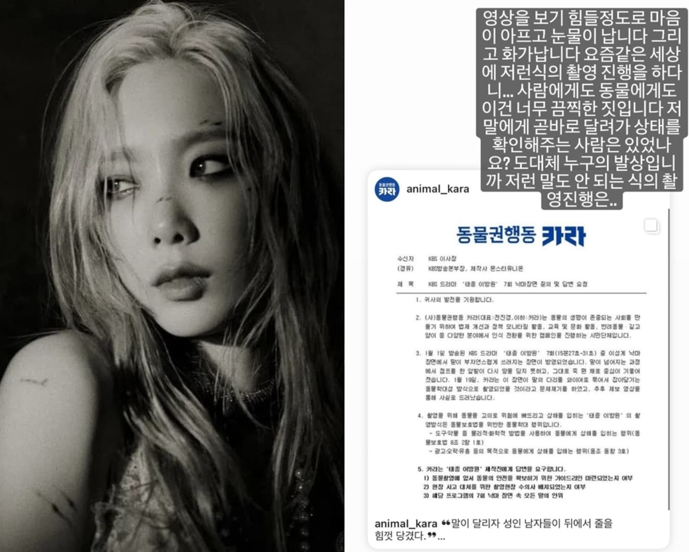 太妍 22 日在 IG 限時動態上寫道:「看到影片心很痛,還有很生氣」,並上傳了動保團體「KARA」的聲明。她說「像最近這樣的世界竟然進行那種形式的拍攝…… 無論對人還是對動物來說,這都是非常可怕的事情。 有沒有人馬上跑到那匹馬前去確認他的狀態? 到底是誰的想法。 進行那種不像話的攝影…」。