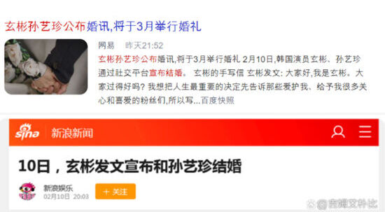 中國新浪娛樂等代表性媒體也報道了兩人結婚的消息,玄彬和孫藝真結婚消息甚至登上微博熱搜一位。雖然韓中兩國民眾互相看對方不順眼,但有網民留言「韓國人是韓國人,孫藝真是孫藝真」,相當搞笑。