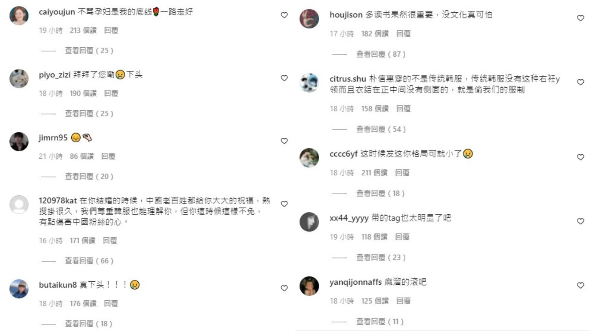 有中國網民看到這三個 HASHTAG,瞬間氣炸留言「韓服不是中國傳統服裝的改良品嗎?」、「了解一下歷史」、「脫粉了」,甚至說「不罵孕婦是我的底線」,貼文傳回中國也引起極大討論。