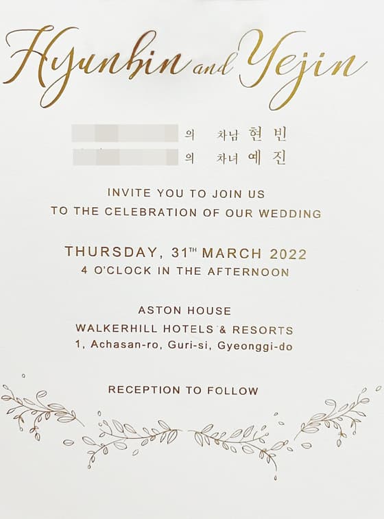 除了先前流出婚禮將辦在於首爾最美飯店「華克山莊首爾酒店」之外,有韓媒也曝光浪漫的喜帖,以純白爲基色,簡潔地寫着婚禮信息,實際舉行時間是在下午四時。