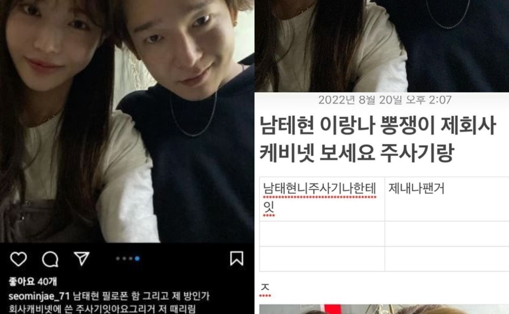 曾參加戀綜《Heart Signal 3》的出演者「徐敏在」,今(20)日在 IG 連續 PO 出多個與歌手南太鉉相關的貼文,稱「南太鉉吸冰毒,在她的家和公司用注射器」,以及聲稱遭到南太鉉暴力對待,並自曝與南太鉉的戀情。