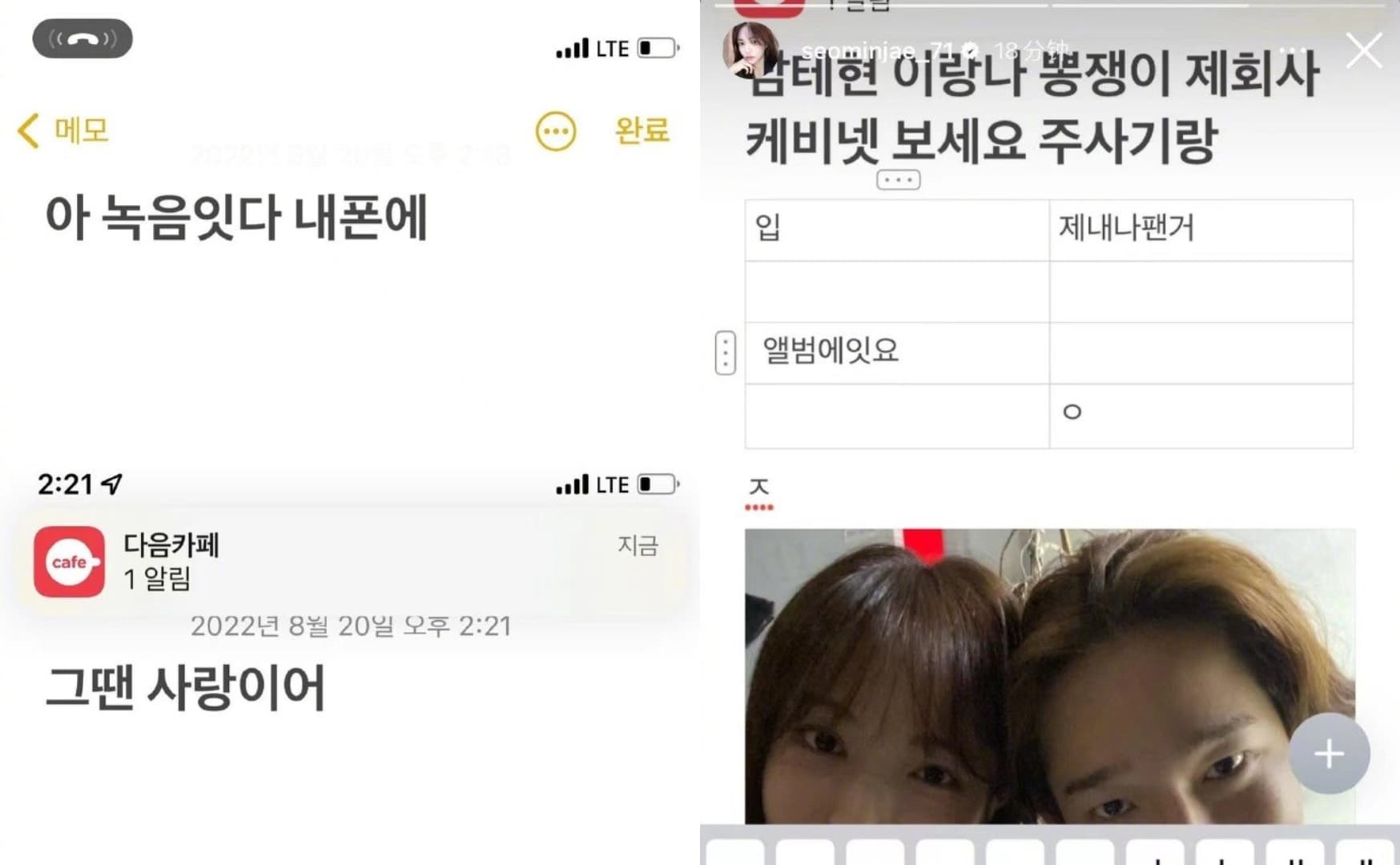 徐敏在(서민재)上傳了「啊,錄音了,在我的手機上」,表示自己手上有證據,還有「那時候是愛情」、「南太鉉你的注射器在我這裏」等莫名其妙的貼文。此後,相關貼文被刪除後又再上傳(目前已全部刪除),引起粉絲和網友們的各種推測,有人疑惑是不是被黑客入侵,並要求解釋。