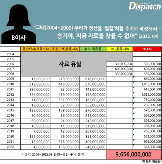李昇基的經紀公司在過去 18 年間一直以專輯收入是赤字等理由未進行收益分配,但實際上 HOOK 在 2009 年 10 月至 2022 年 9 月期間就通過李昇基的音樂作品進賬 96 億韓元,加上因為丟失賬本而無從查起的 2004 年 6 月至 2009 年 8 月的收入,李昇基的音樂作品為 HOOK 帶來的收入已經超過 100 億韓元。