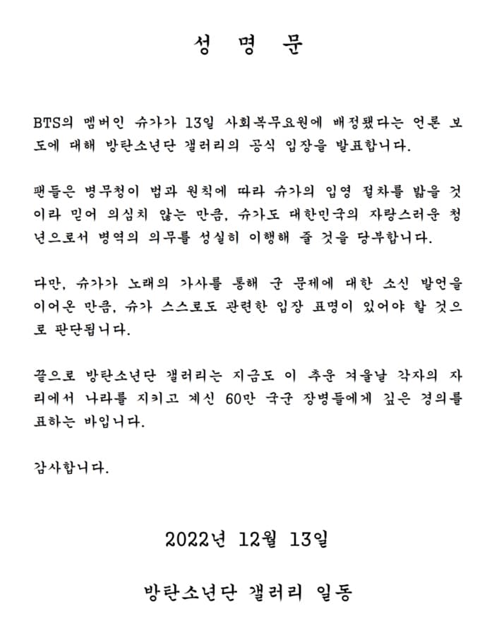 而在今(13)日下午,有自稱是防彈少年團粉絲團發表聲明,指出 SUGA 多次透過歌詞表明入伍信念,所以本人應該出來表明立場,粉絲們在聲明表示「堅信兵務廳會根據法律和原則履行 SUGA 入伍程序,因此希望 SUGA 作爲韓國自豪的青年,誠實履行兵役義務」。