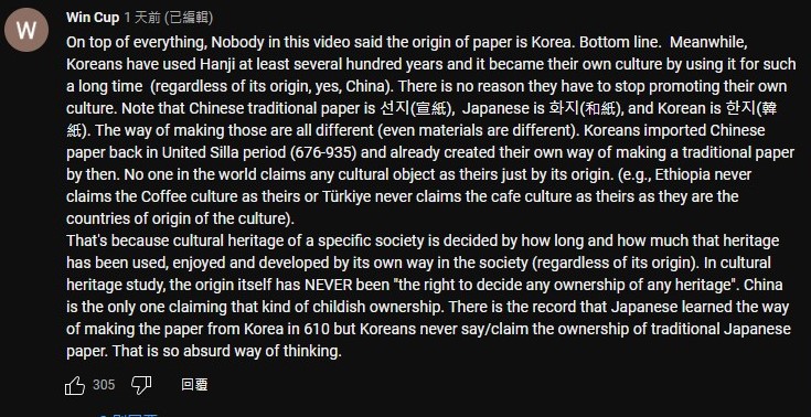 該網友表示,世界上沒有人僅憑其來源就聲稱任何文物是他們的,舉例,如衣索比亞、土耳其從未聲稱咖啡文化是他們所有。這是因為一個特定社會的文化遺產取決於該遺產在社會中以其自身的方式被使用、享受、發展的時間和程度(無論其來源如何)。在文化遺產研究中,起源本身從來不是「決定任何遺產所有權的權利」。中國是唯一聲稱擁有這種幼稚所有權的國家。有記錄表明,日本人在 610 年從韓國學習了造紙方法,但韓國人從未說過/聲稱擁有傳統日本紙的所有權。可見這是多麼荒謬的想法。