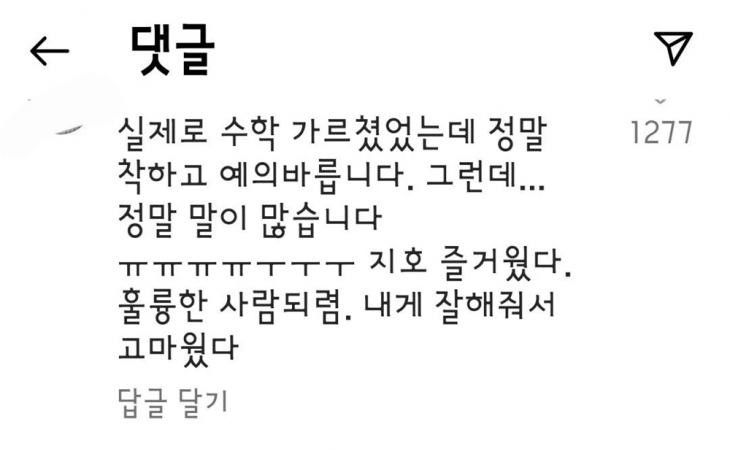 此後,有網友留言稱「實際上教過志浩數學,他本人真的很善良,很有禮貌,但是話真的很多。教到志浩很開心,成爲優秀的人吧,謝謝你對我這麼好」。另一位網友也認證,「我的熟人也說了同樣的話,因爲話多所以很累」。