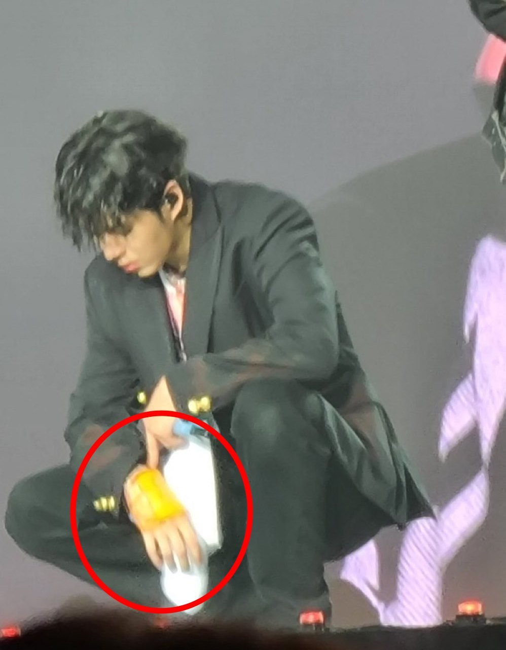 不僅是本人,其他成員和現場粉絲也受到驚嚇,相當緊張尹材赫傷勢,尹材赫被工作人員安排返回後台接受治療,過了約 5 分鐘後,尹材赫右手貼上膠布回到舞台。
