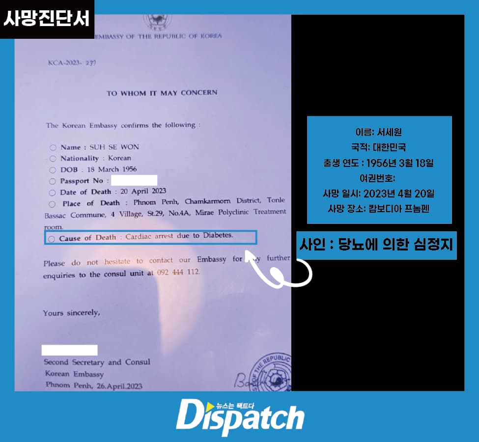 死亡案件似乎疑點重重,根據 Dispatch 報導,在治療徐世源的醫院的 1 樓儲物櫃和 2 樓治療室垃圾袋中發現麻醉劑「異丙酚」和注射器,然而柬埔寨警方隱瞞了事實。