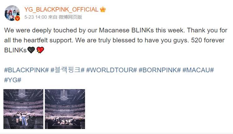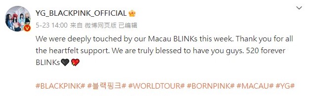 微博最初寫道「We were deeply touched by our Macanese BLINKs this week.」(我們深深被澳門 BLINKs 感動),「炎上」後修改為「Macau BLINKs 」。
