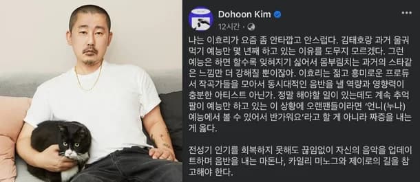 他認為,「李孝利是一位可以聚集年輕有趣的製作人和作曲家,有足夠能力和影響力發行專輯的藝人。雖然真的有事情要做,但是一直做回憶綜藝的這個狀況下,如果是老粉絲,就不應該說「很高興能在綜藝節目中看到姐姐」,而是應該發脾氣」。還補充,「即使無法恢復全盛期的人氣,也可以參考麥當娜、Kylie Minogue 不斷推出新音樂和發行專輯的道路」。
