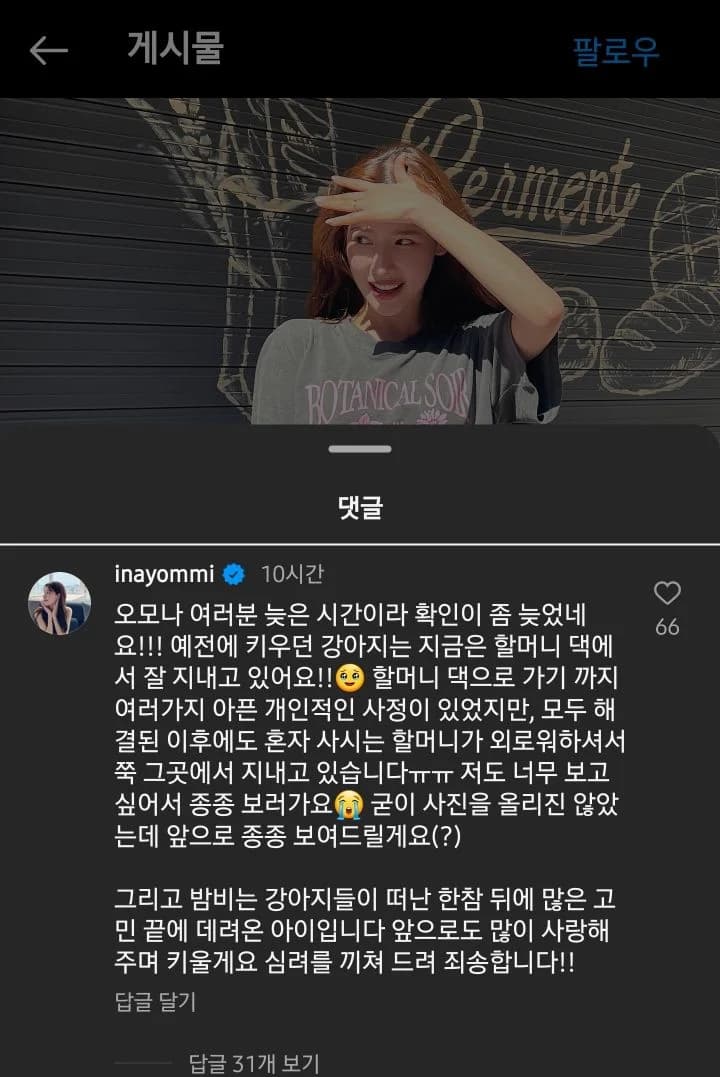 李娜妍表示自己也很想念狗狗們,所以經常會去看牠們。雖然沒有上傳照片,但是以後會經常給大家看的。至於現在的「斑比」是小狗們離開很之後,經過深思熟慮才帶回來的孩子,以後也會繼續給予疼愛和撫養。