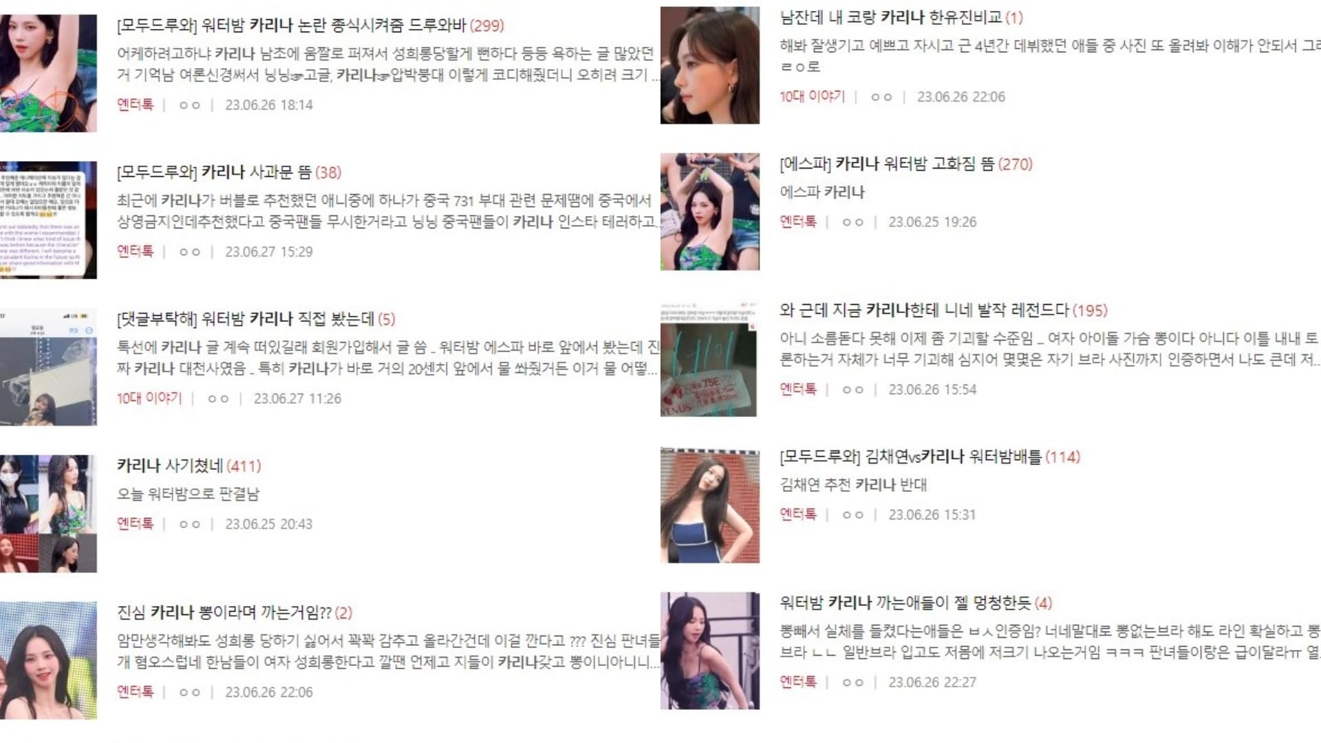 在 pann 馬上出現數十個貼文,毫不忌諱在網上討論 Karina 的胸部大小,甚至出現分析貼文指出「Karina 穿了束胸」,有網友認為明明可藉此製造話題、提升人氣,應該適當施展魅力,但公司卻錯過了機會。(pann:Karina)