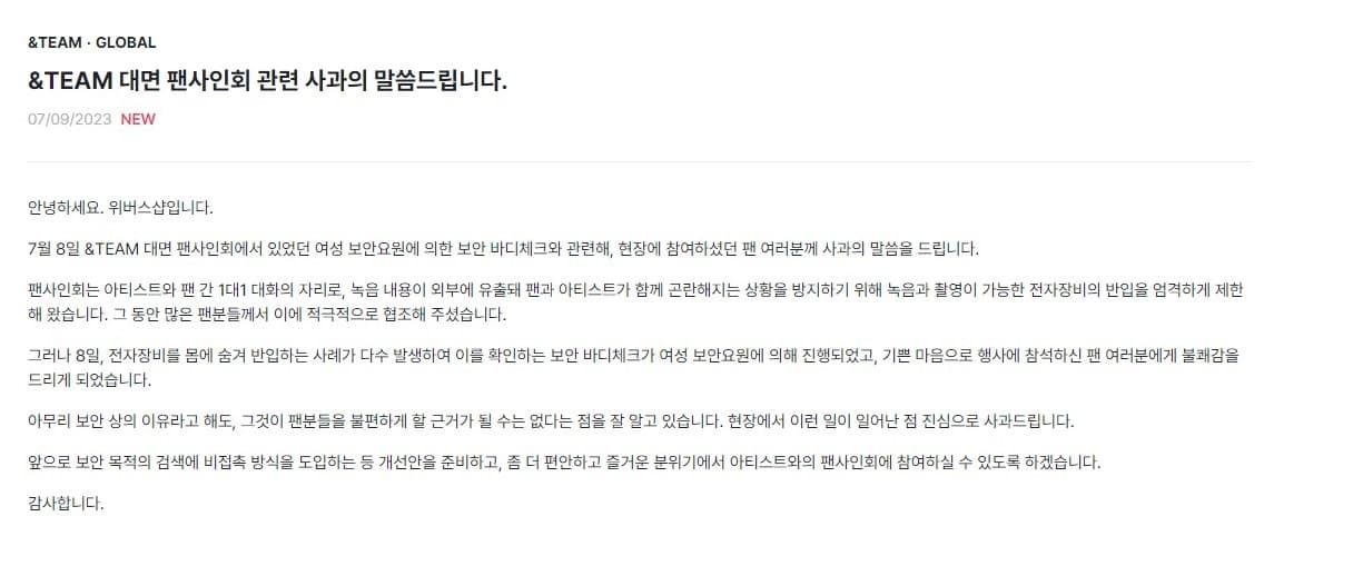在今(9)日晚上, &TEAM 韓國簽售會主辦方 Weverse Shop 發表道歉公告,並向大眾說明情況,由於簽售會是藝人和粉絲一對一對話的場合,為了防止錄音內容泄露到外部,讓雙方陷入困境的情況,一直嚴格限制攜帶可以錄音和拍攝的電子裝備,這段時間許多粉絲積極配合。然而,8 日發生了很多將電子裝備藏在身上帶入的事例,身體檢查由女性保安人員負責,給懷着喜悅的心情參加活動的粉絲們帶來不悅。