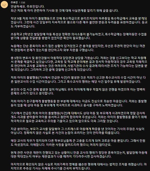 朱浩民表示,錄音中很難看作是單純的訓育管教,爲了從客觀的角度判斷是否存在問題,向外部諮詢,共與 5 名律師及龍仁警察署兒童虐待負責人進行商談。 此後,他表示,雖然想從學校層面解決問題,但是得到「情緒虐待兒童的情況,教育廳自行判斷後很難更換教師,只能根據司法機關的調查結果採取措施」的回答,經過深思熟慮後向警方報了案。