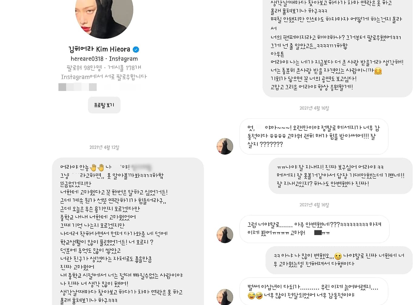 同班同學校友 D 表示,「在我學生時代,是我最感謝的朋友,但是好像被誤會了太多,所以很傷心,所以寫了這篇文章」,她說中學一年級遭到霸凌,多虧金赫拉才擺脫困境,還說以後一起去小賣部,讓她減少被排擠。畢業之後,偶爾會打招呼,但自然而然失去了聯繫,偶爾通過 SNS 了解她的近況,最後也鼓起勇氣發了 DM。她曬出 2021 年 4 月的訊息,感謝金赫拉在學生時代的幫助,而金赫拉也回答「好久不見,信息真的太讓人感動了。 謝謝你,平白無故讓我得到了力量。」