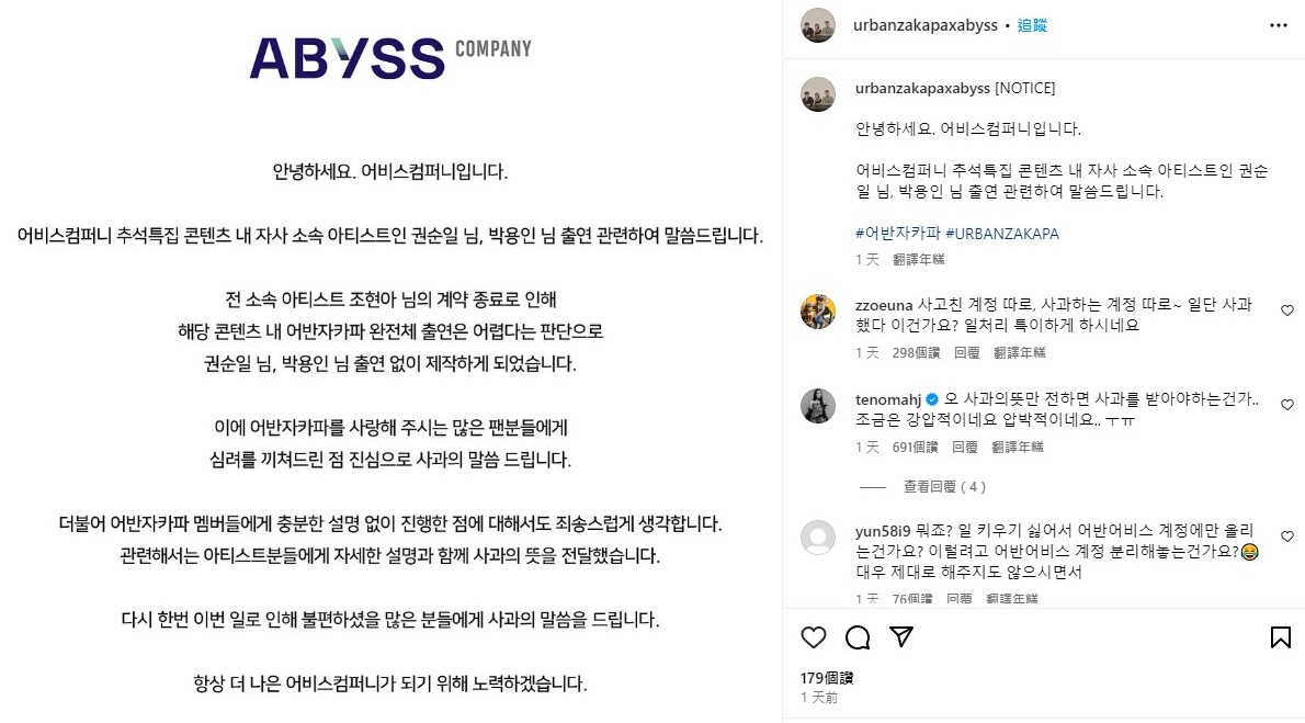 在引發爭議後,經紀公司對此深表歉意,通過 Urban Zakapa 官方 SNS 上傳道歉文,「由於前所屬藝人趙賢雅的合約終止,因此認為 URBAN ZAKAPA 很難在相關內容中完全體參與,所以在沒有朴容仁、權純一的情況下製作」。對於在沒有向 Urban Zakapa 成員進行充分說明的情況下進行的活動,所屬社再次向成員、粉絲表達歉意。