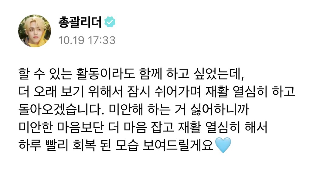 S.COUPS 也透過 Weverse 向粉絲留言,「我至少想參加一些我能做的活動,但是,為了能更久地見到你們,所以我會稍微休息一段時間,認真進行康復訓練後再回來。因為(粉絲們)不喜歡(我)覺得抱歉,所以比起感到抱歉會更努力專注於做康復訓練,會盡快讓大家看到恢復的模樣的」。