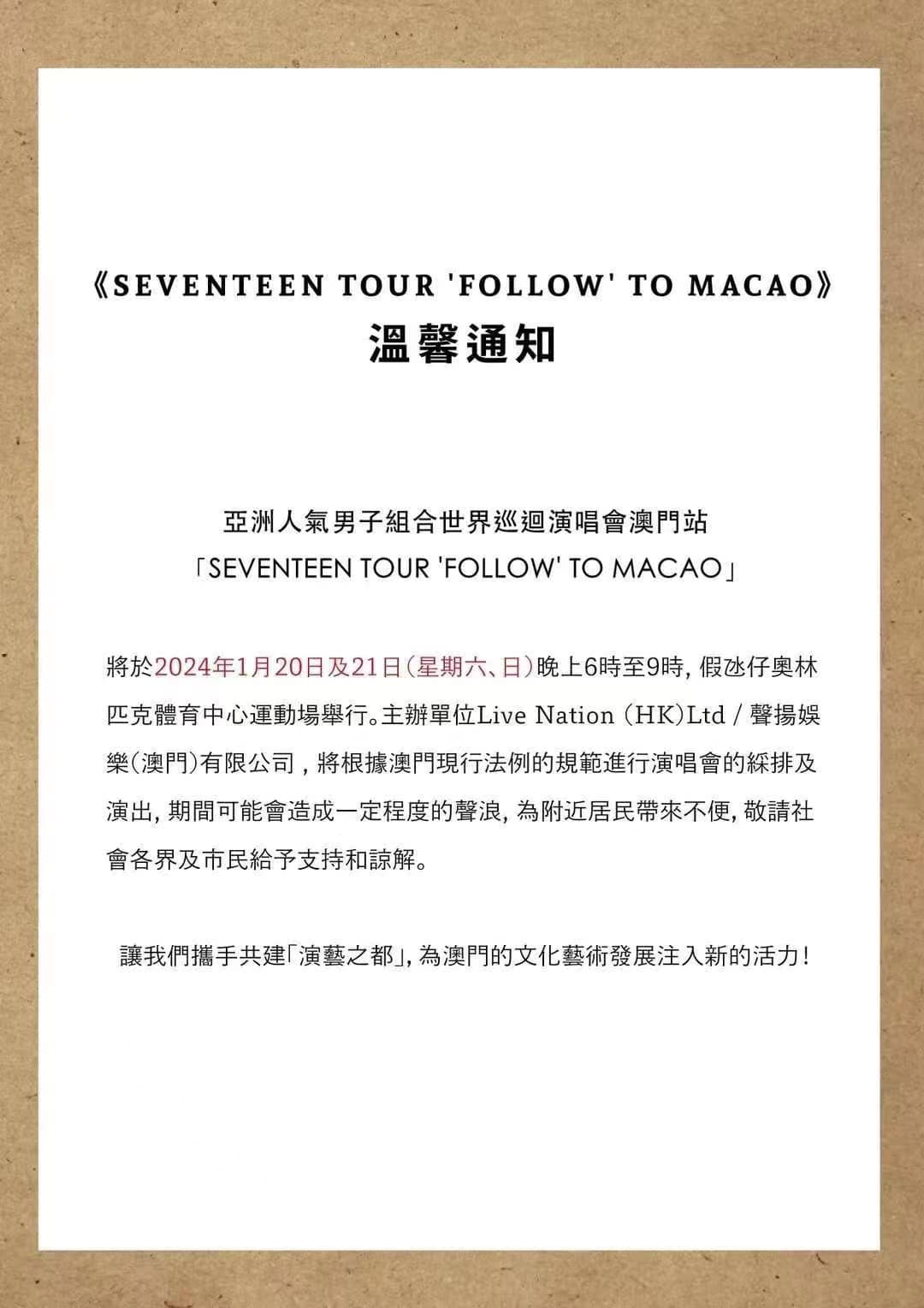 男團 SEVENTEEN 近期展開亞洲巡演《SEVENTEEN TOUR ‘FOLLOW’ TO ASIA》,繼泰國、菲律賓後,本週六、日(20 ~ 21 日)來到澳門站。有別於韓團選擇各大綜合度假村內表演場館,SEVENTEEN 向澳門政府租借運動場,也是極少數選擇在當地戶外運動場舉行演唱會的歌手。因此,澳門政府為了演出安全順利,提前對週邊區域進行管制,以應對大量粉絲的到來,但措施也引起附近居民不滿。