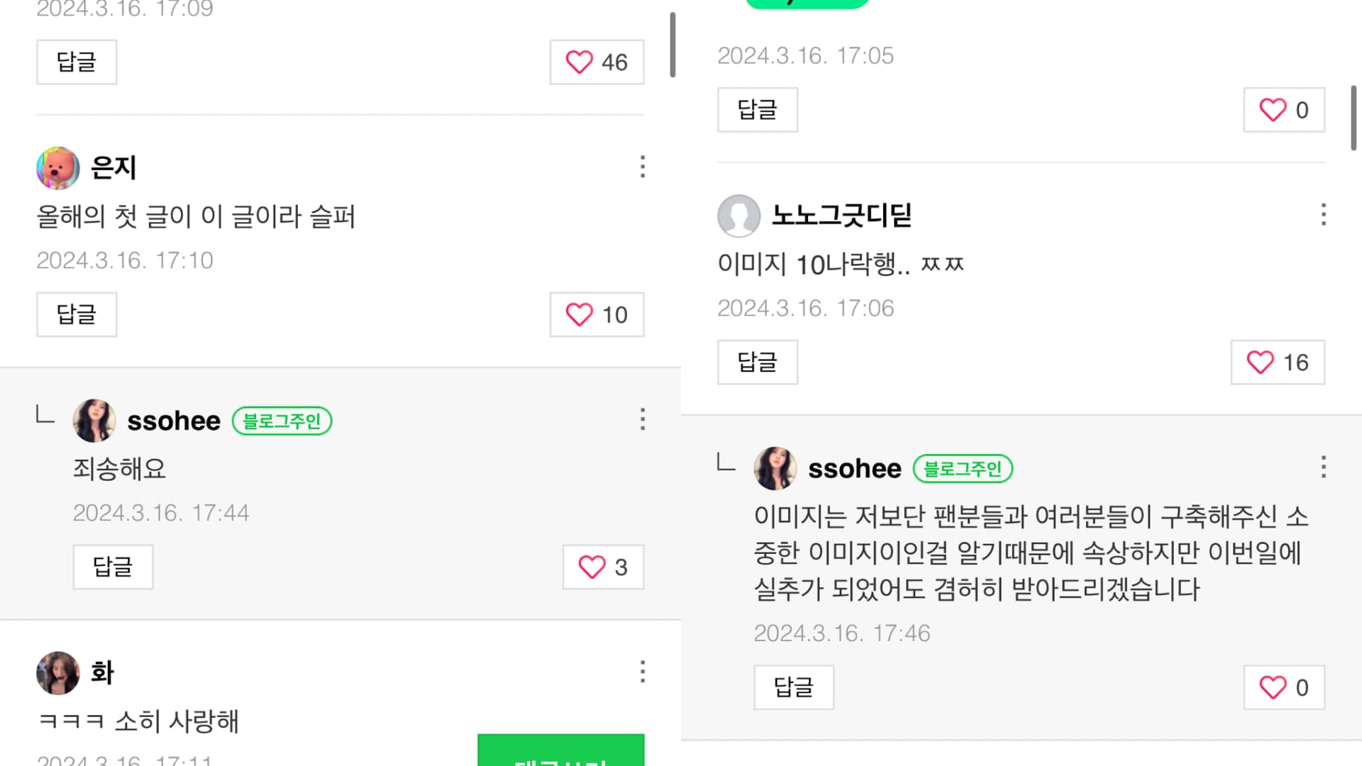 韓韶禧過去不定時透過部落格與粉絲交流分享近況,有粉絲留言「今年第一篇是這篇文章,好悲傷啊」,韓韶禧對此留下一句「對不起」,接著有網友留下「形象崩壞」,她也深感抱歉,「我知道形象是粉絲們和大家賦予的珍貴形象,所以雖然很傷心,但是即使因爲這次事件而受損,也會謙虛地接受」。