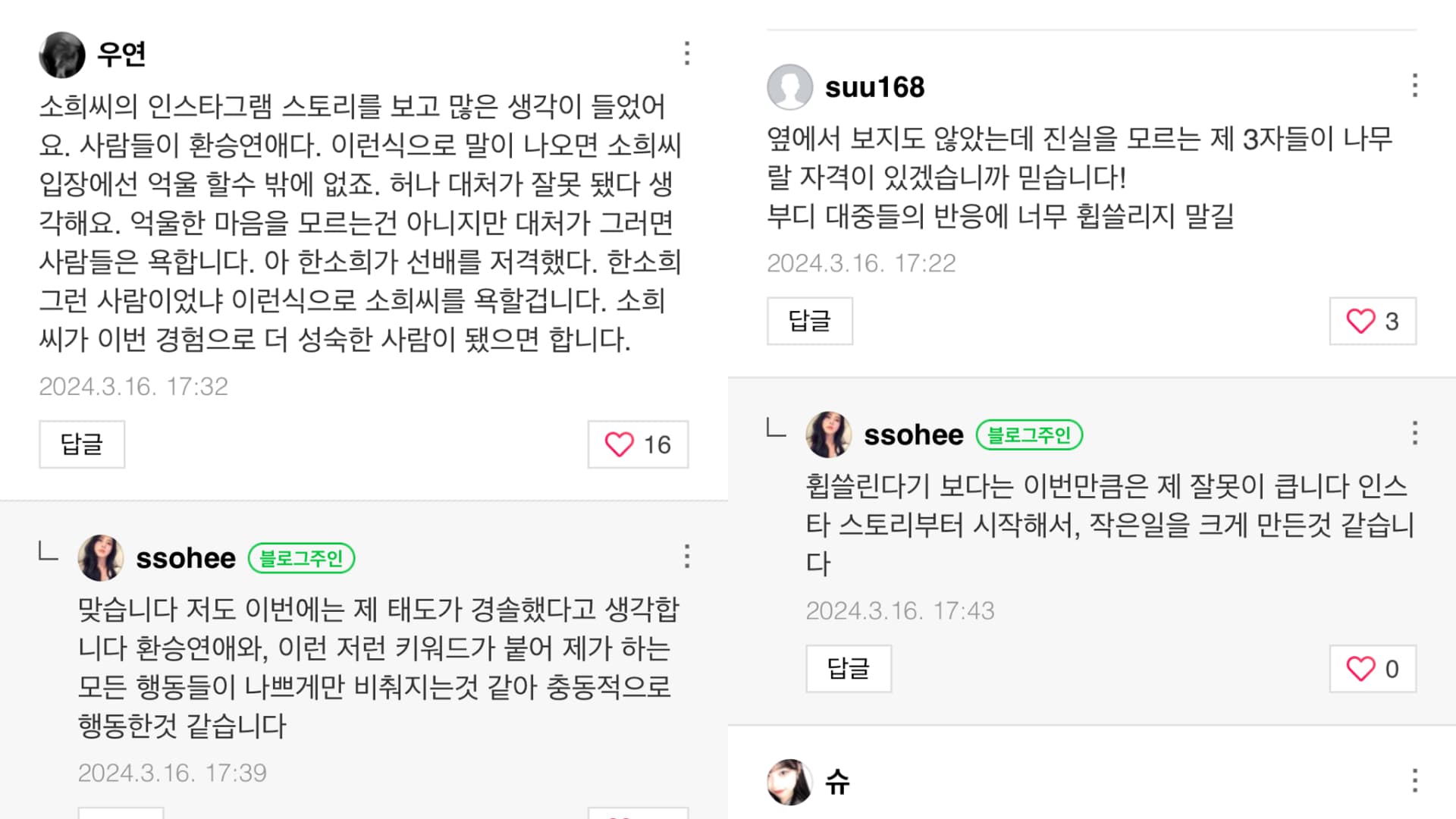 一位網友寫道「大家並非當事人,第三方不知道真相,有資格指責嗎,千萬不要被大眾反應所左右」;另一位也寫道「看到 IG 限動故事後,產生了很多想法,雖然外界在討論換乘戀愛,站在韓韶禧的角度,會覺得很委託,但是這一次處理確實不好,變成狙擊前輩,希望能吃一塹長一智」,韓韶禧承認從 IG 限動開始是自己把小事化大,被傳換乘戀愛後失去理智,行動衝動和輕率。
