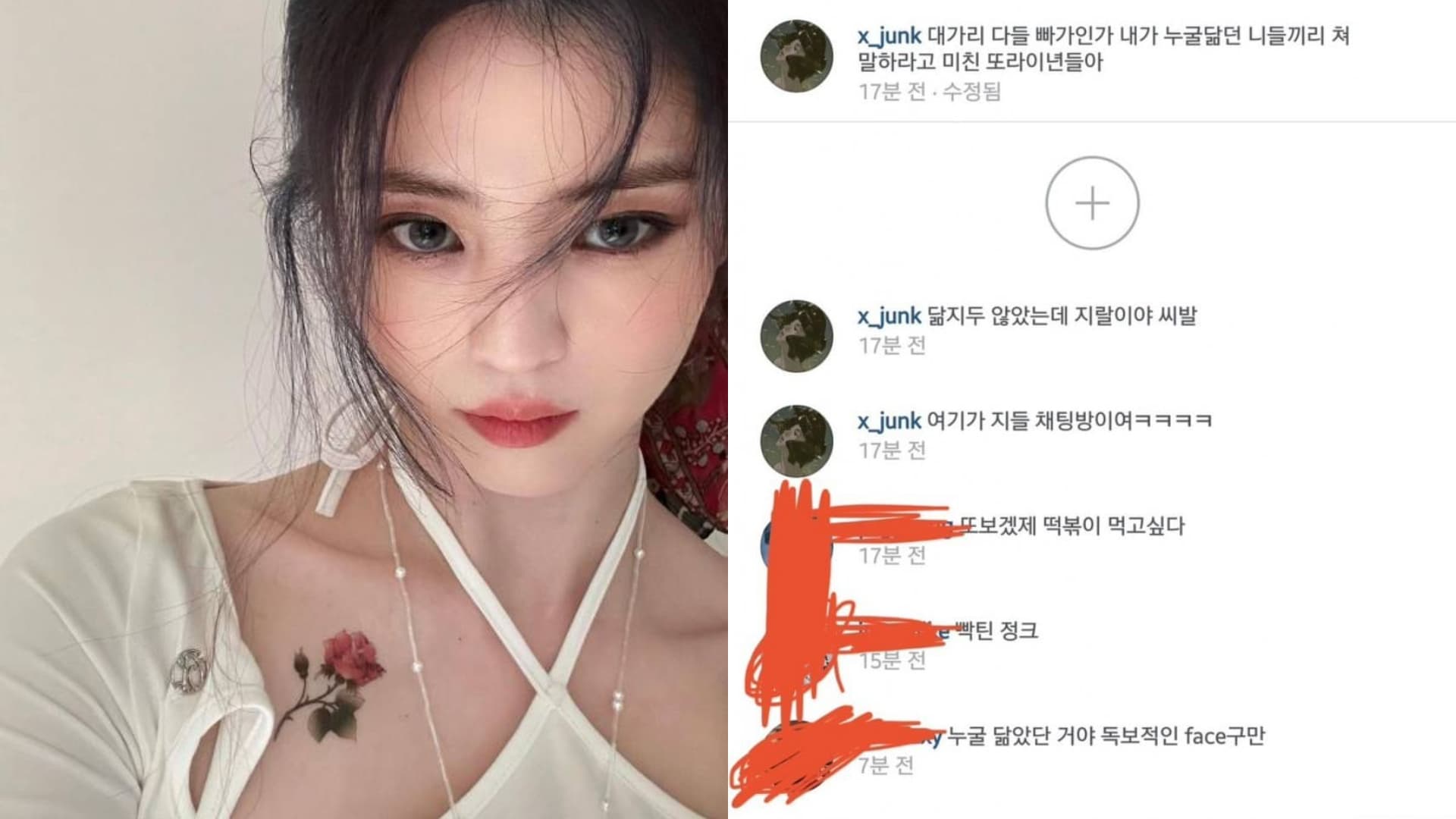 出道前擔任服裝模特兒的韓韶禧,早已小有名氣,透過 IG 帳號「x_junk」與網友互動,當時有網友留言「妳長得好像宋慧喬喔」,卻引起韓韶禧接連失控飆罵,「你們都是智障嗎?我來告訴你們這些瘋子我像誰好了」、「我們根本長得不像,神經病喔,西八!」、「這裡難道是他們的聊天室嗎」。