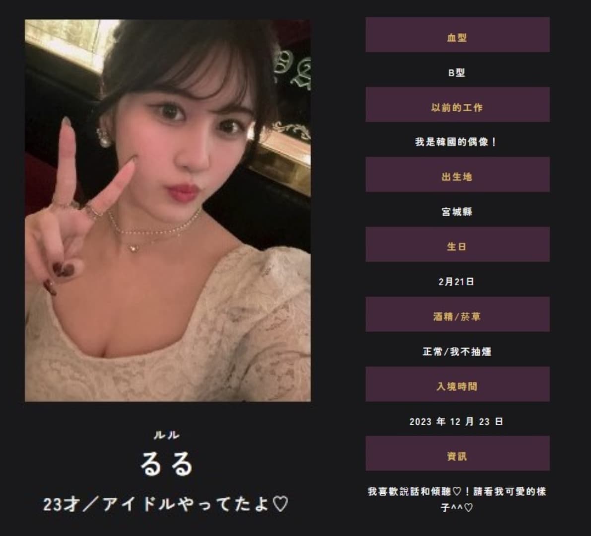 據此前的宣傳片介紹,「從 18 歲開始作爲 K-POP 歌手活動 6 年,現在爲了籌集設立舞蹈工作室的資金,正在以俱樂部孃的身份工作」。