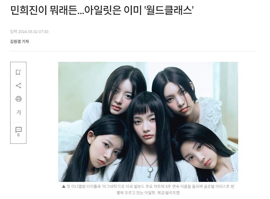 韓媒《spotvnews》昨(2)日的新聞標題寫道,「不管閔熙珍說什麼…ILLIT 已經是『世界級』了」,內容提到 ILLIT 不只在韓國國內取得好成績,出道曲〈Magnetic〉也闖進 Billboard Hot 100,書寫 K-POP 新歷史,在其他 Billboard 榜單也榜上有名。最後寫道「ILLIT 憑藉首張專輯已經躋身全球明星行列」。