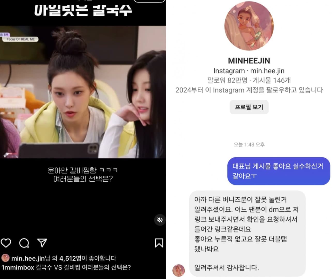 閔熙珍所按讚的 IG 貼文,內容是 ILLIT 成員在問答中選擇刀削麵還是排骨。此前 NewJeans 成員 Minji 曾在節目中說了一句「刀削麵是什麼?」,讓她遭受批評並且公開道歉。隨後網友 PO 出閔熙珍的回應,「剛才一位 Bunnies 告訴我按錯了,好像是一位粉絲私訊了網址讓我確認,然後我點進去了那個,沒有按過讚,估計是失誤雙擊了,謝謝提醒」。