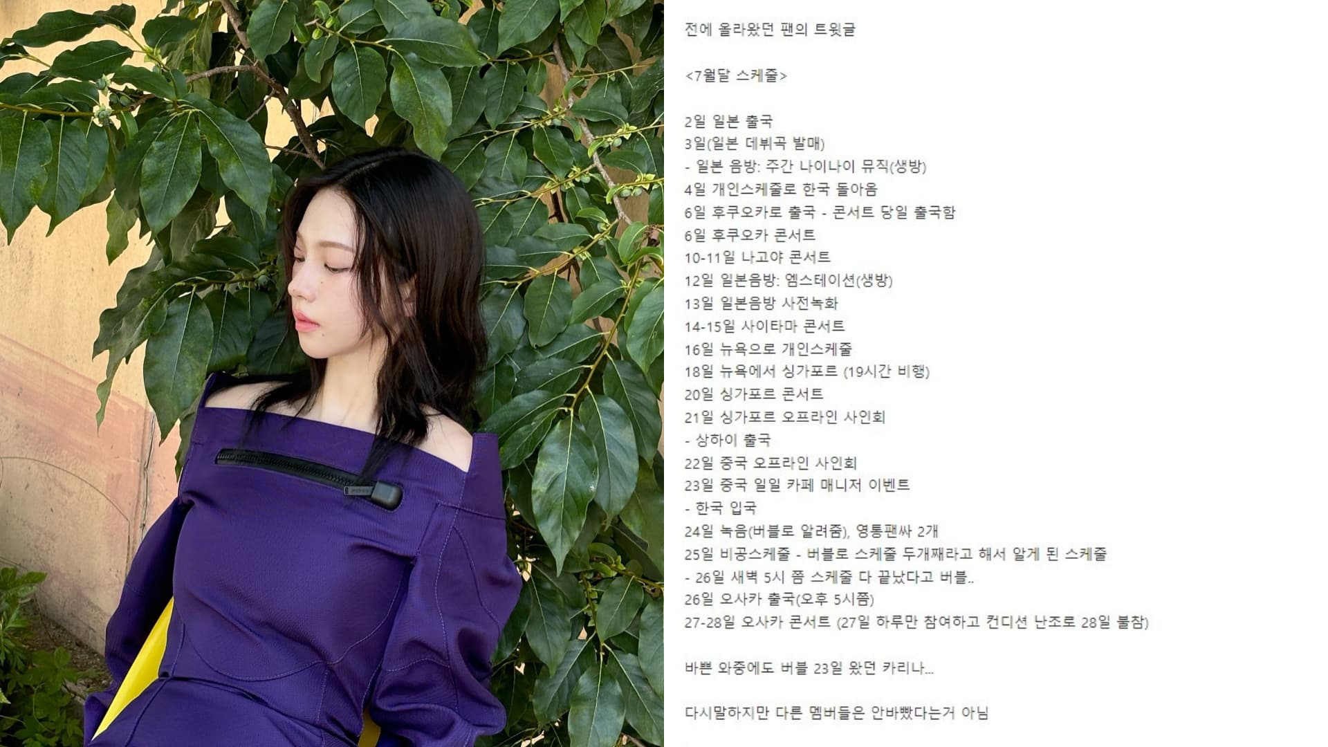 據了解,結束今明兩場福岡演唱會後,將飛往香港、台北開唱,接著又回到日本東京,根本沒有時間讓她們好好休息,得知如此緊湊的行程,網友們紛紛留言,「巡演期間就只專注巡演吧,聽說 RIIZE 日程都是這樣」、「其他成員已經累壞缺席過一次,Karina 能撐到現在已經很厲害」、「別對孩子太過份,照顧一下她們健康吧」、「這日程不累倒才怪」、「有傳言說公司要專注在 aespa 和新男團,果然是真的」、「SM 別太過份,巡演中少接點個人行程吧」、「日程安排得讓人窒息」。