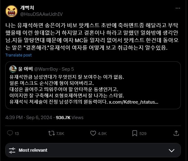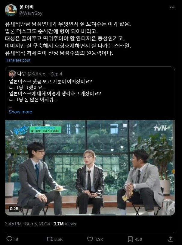 一些網友更把提問與男權聯繫上,其中一位網友寫道,「沒有比劉在錫更能體現什麼是男性連帶的人了。Elon Musk 瞬間也變成了哥哥。大聲是個應該引以爲傲的弟弟。只樹立好形象,稱兄道弟,走紅的類型。劉在錫式的處世術才是真正男權主義的原動力」,相關留言吸引超過 5,500 次轉發。