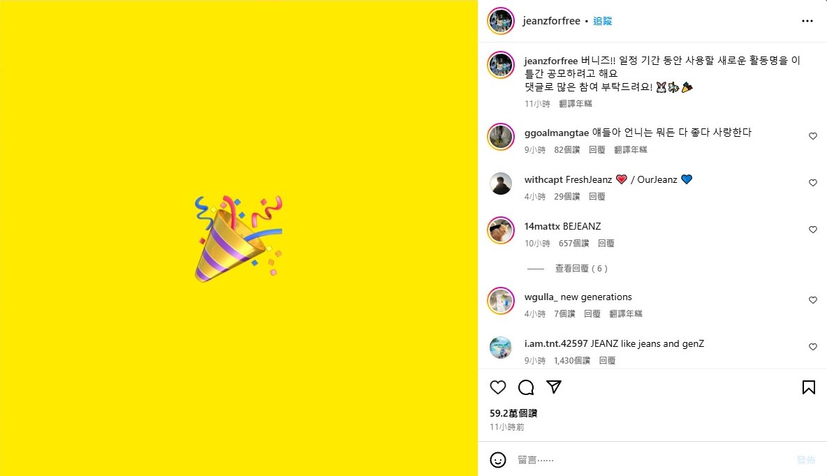 成員們在新帳號「@jeanzforfree」發文,「Bunnies!我們將在兩天內募集新活動名,希望大家多多參與」,貼文半天吸引近 60 萬讚、6.7 萬則留言,粉絲紛紛寫下想法:「JEANZ(jeans + genZ)」、「Newer Jeans」、「NewJeanz」、「BEJEANZ」、「Jeanz Club, Blue Jeanz」等等,反應熱烈。
