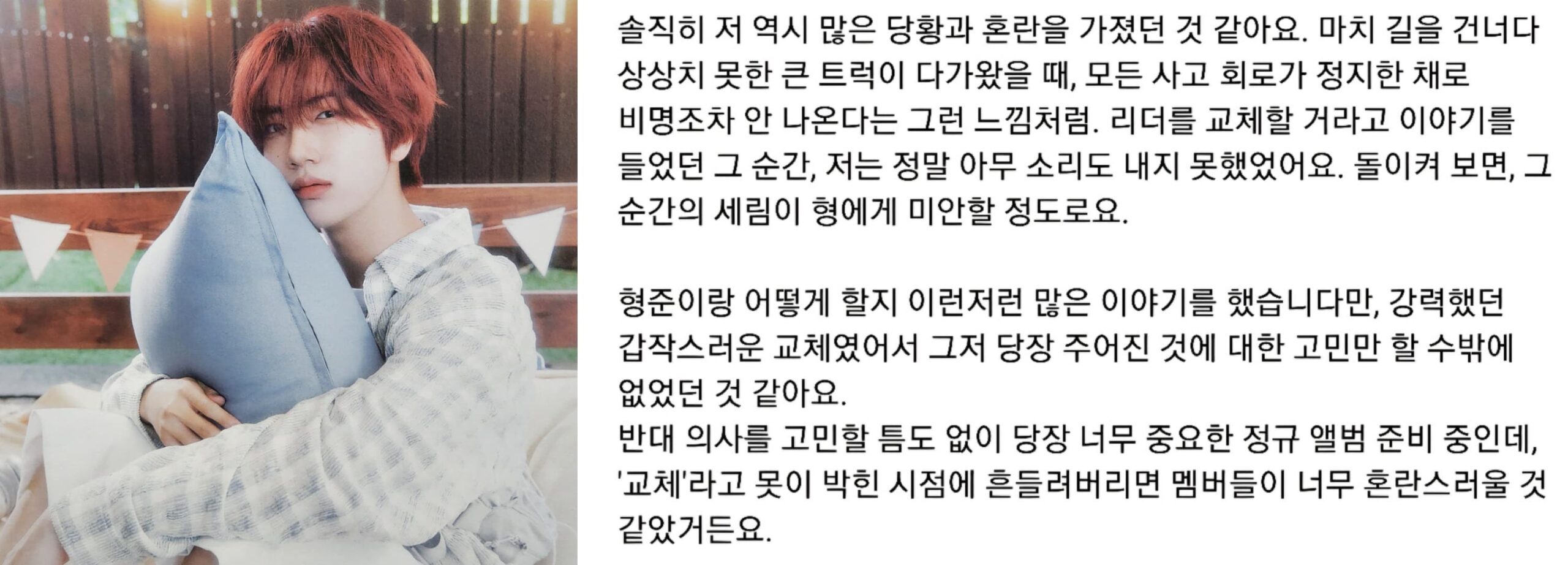 新上任的隊長刑準緊接著發文,成員們聽到消息後感到震驚與混亂,一開始難以接受、需要時間整理情緒。雖然隊長變了,並不代表我們會變,「我們是那種能互相補足不足的關係」,我們之所以能這麼堅定又穩固地走到現在,固然是因為成員們都配合得很好,但我認為世琳哥的功勞也非常大,和世琳哥、元進哥一起對話時,也討論了未來該怎麼辦,但我們的結論是「我們不會改變,會像以前一樣」。我們也儘快整理好心情,準備正規回歸專輯,希望粉絲不要擔心,繼續給予支持。