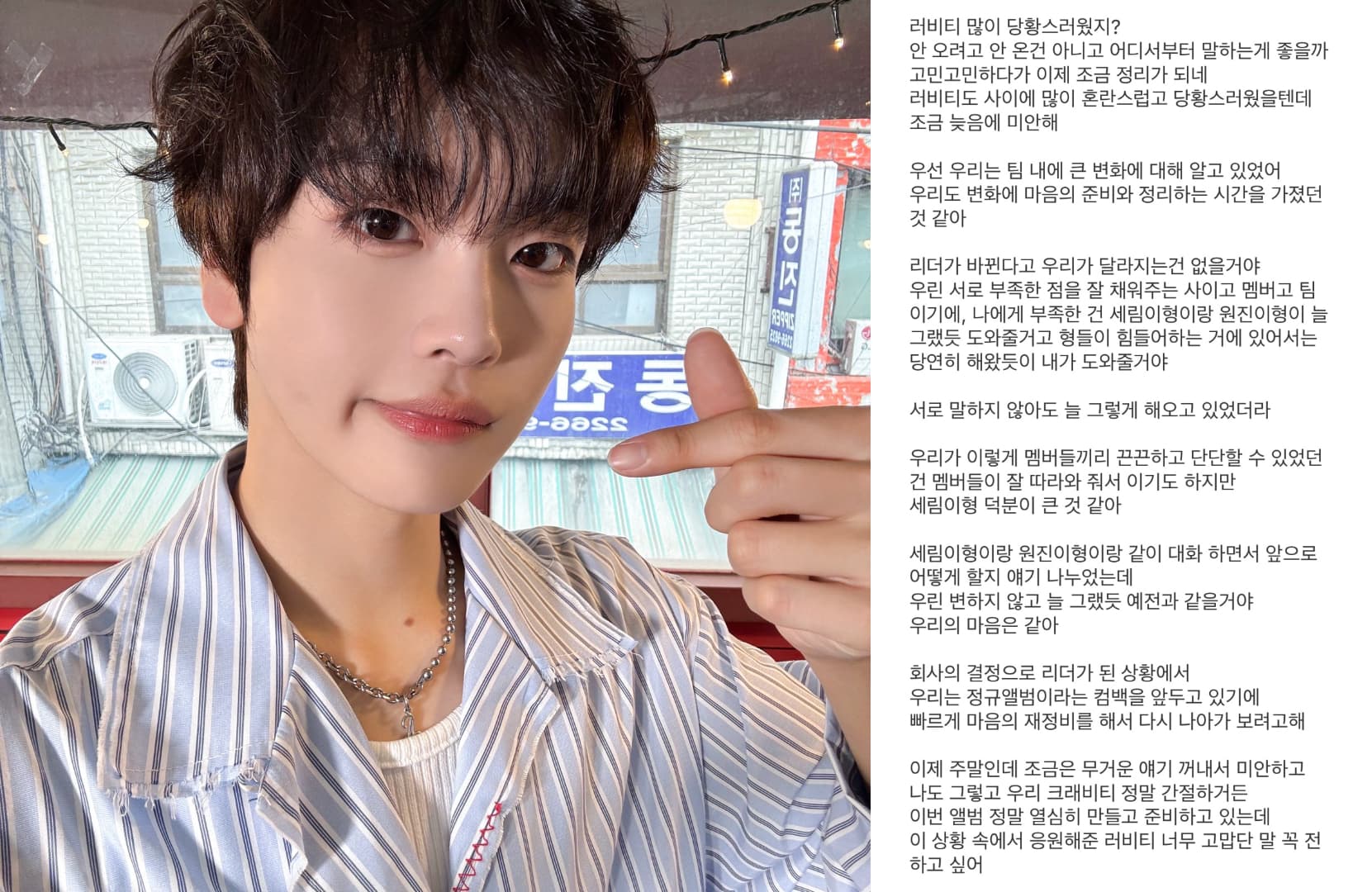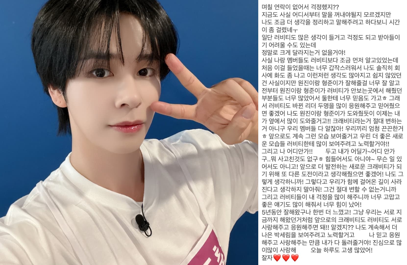 他表示,「剛開始聽到時也太驚訝了,說實話我也有點生氣,心裡想了很多,並不容易接受」,但也強調信任新隊長們,「元進與刑準從以前開始就常常在 LUVITY 看不到的地方默默努力」,請大家一起支持他們。即使離開隊長位置,CRAVITY 的本質與團結不會改變。最後,他表達了對粉絲滿滿的感謝與愛意,承諾會持續努力、回報大家的支持。