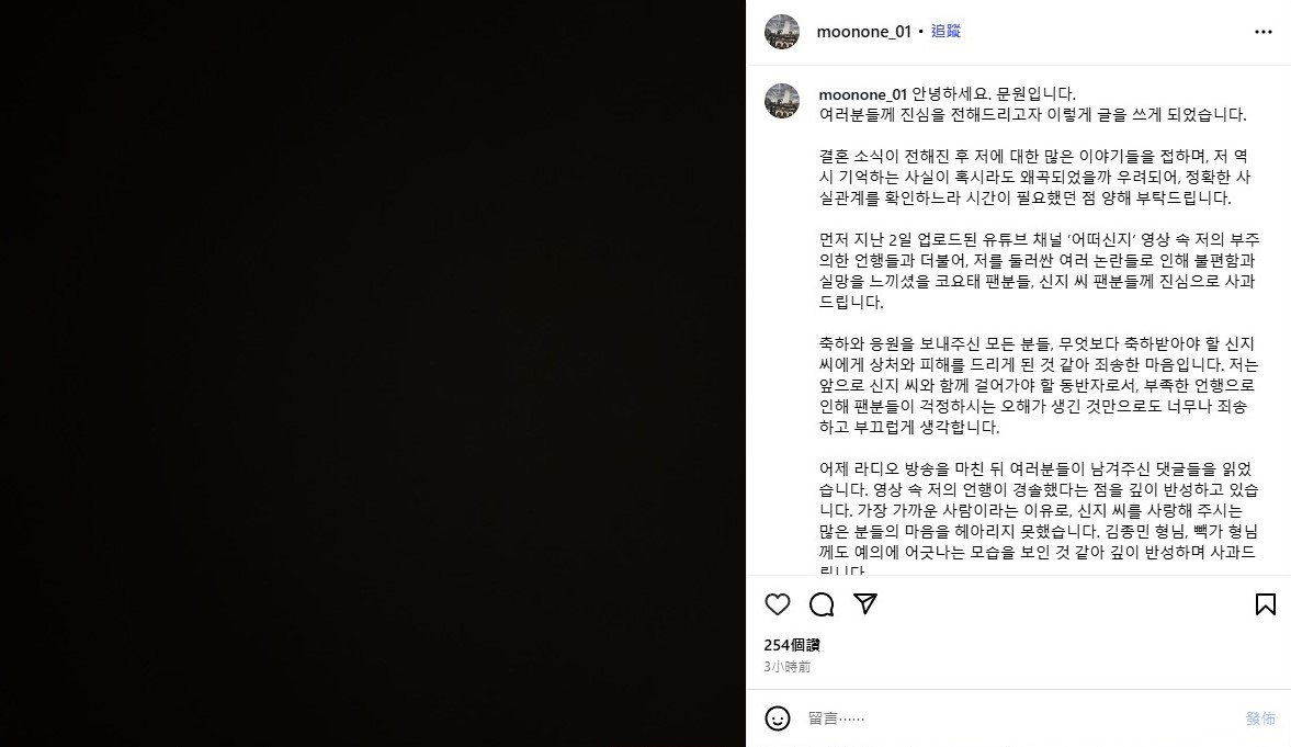 最後,文元再次致歉:「造成社會紛擾我深感抱歉,我會更負責任地迎接與申智的未來生活,努力成為更成熟的人」。