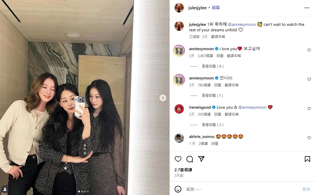 貼文同時公開一張三人自拍照,畫面中李柱英、ANNIE,以及模特兒 Irene 對著鏡子前甜笑自拍,展現私下親密友情。