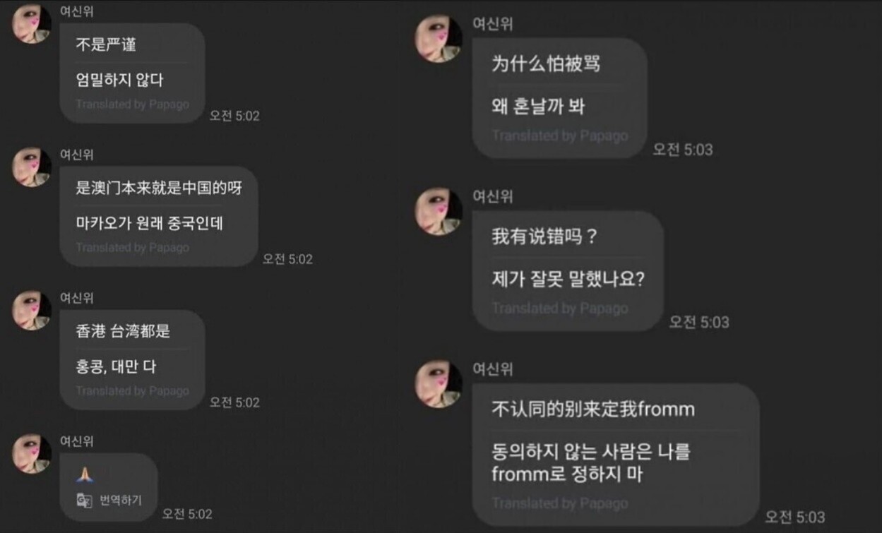 不少網友和粉絲在社群平台與留言區留言表達強烈不滿:「這就是為什麼我不喜歡有中國成員的團體」、「第一次看到有中國人講得這麼直接」、「嗯…看起來是在鋪路準備回中國發展,畢竟有『韓國出道』這個光環,去中國就能吃得開」、「就是這樣才會出現那些『已經惹事的中國人』和『還沒惹事的中國人』之分,話說這團不是也有台灣成員嗎?」、「如果你對中國如此自豪,那就回中國去吧」、「團裡居然有台灣成員耶,還這樣講?真的太扯了吧」、「拜託別再把中國人放進K-pop團體了,他們的思想真的讓人噁心到起雞皮疙瘩」、「不只她啦,現在當紅偶像團的中國成員不都是那種想法嗎?超級噁心」、「真是個自我意識非常膨脹的人,如果那麼喜歡中國,就去中國發展啊,幹嘛還留在韓國活動?少在那邊喊人氣下滑之類的,真可笑」、「那你就滾回你們國家去吧;這麼了不起的中國,就回去發展不就好了?幹嘛寄生在 K-pop 裡講什麼「一個中國」那套,真的有夠討厭ㅋㅋ」;另一方面,中國網路社群則紛紛稱讚她的舉動,認為她勇敢發聲、立場鮮明。