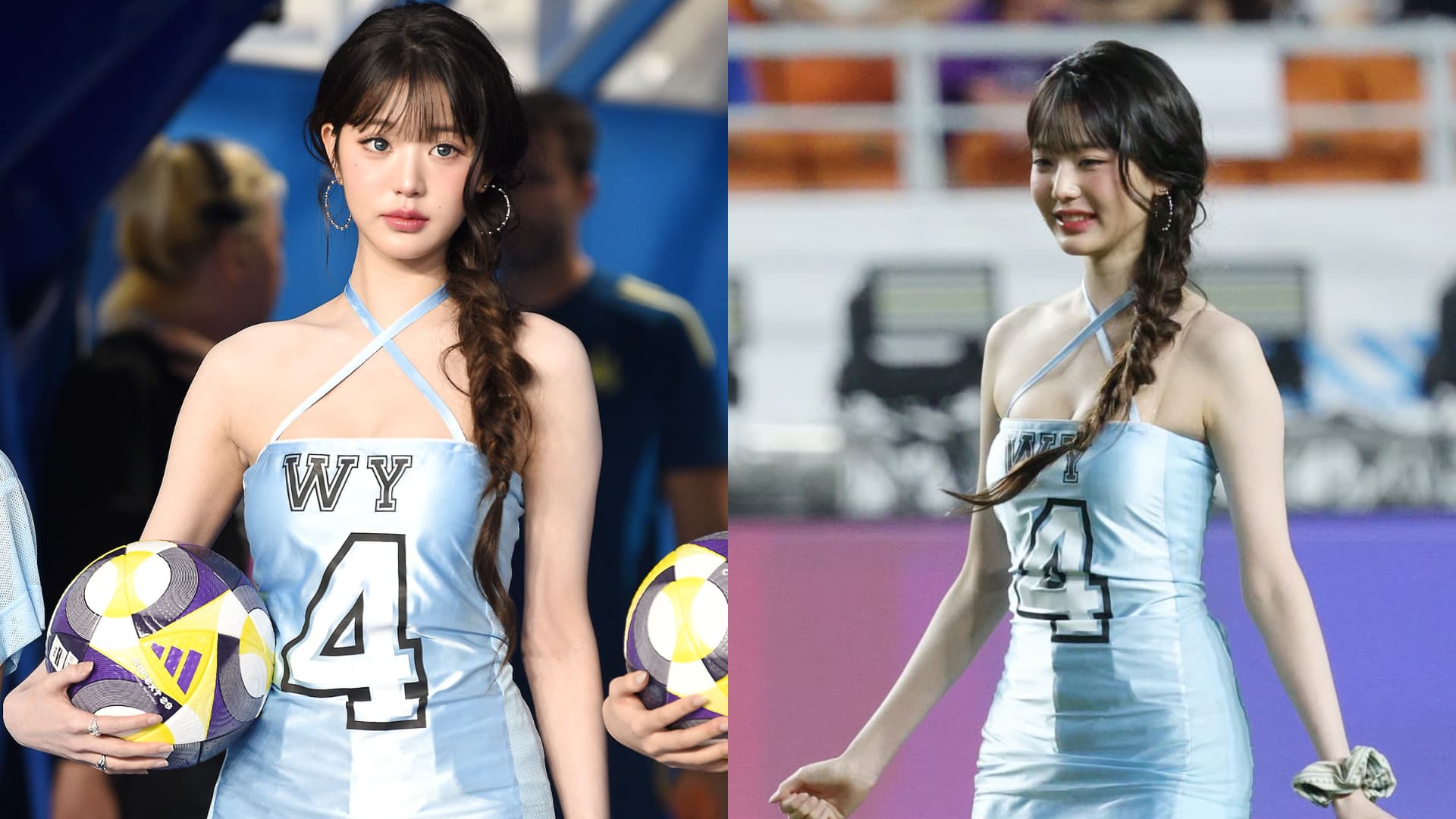 IVE 當天的服裝以清爽的藍色系為主,搭配運動鞋展現青春活力。但不同於其他成員的偏休閒造型,張員瑛則在短褲外搭配性感露肩貼身迷你裙,一腳開球後可愛地用雙手摀臉、露出靦腆笑容,還向觀眾送飛吻,瞬間成為焦點。