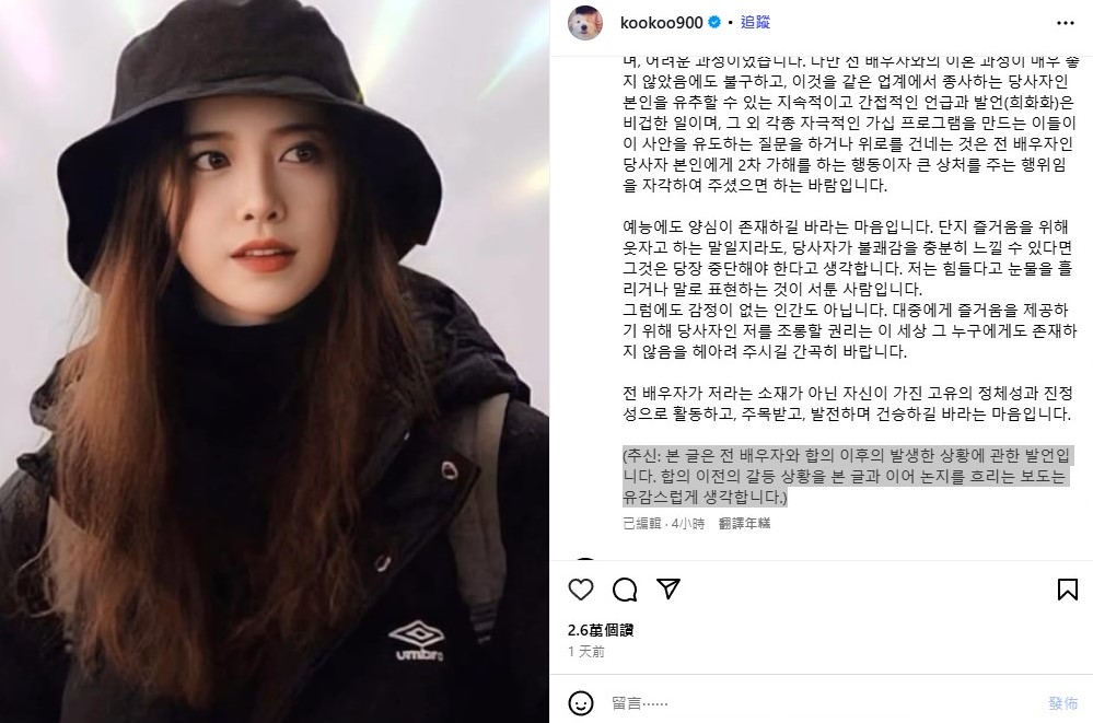 具惠善在文末增加補充:「附註:本篇發言針對的是與前配偶達成離婚協議之後發生的事。若將協議前的衝突與本篇內容混為一談,造成論點模糊的報導,我深感遺憾」,此舉似乎是在回應外界對她「雙標」的質疑。她反駁稱自己的發言是針對「協議後」的事件,與過去不同,並批評媒體未作區分就報導。
