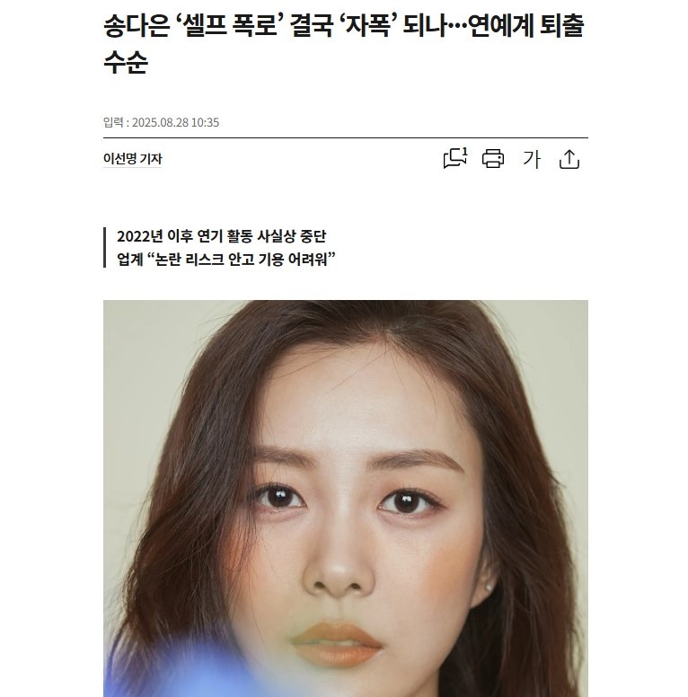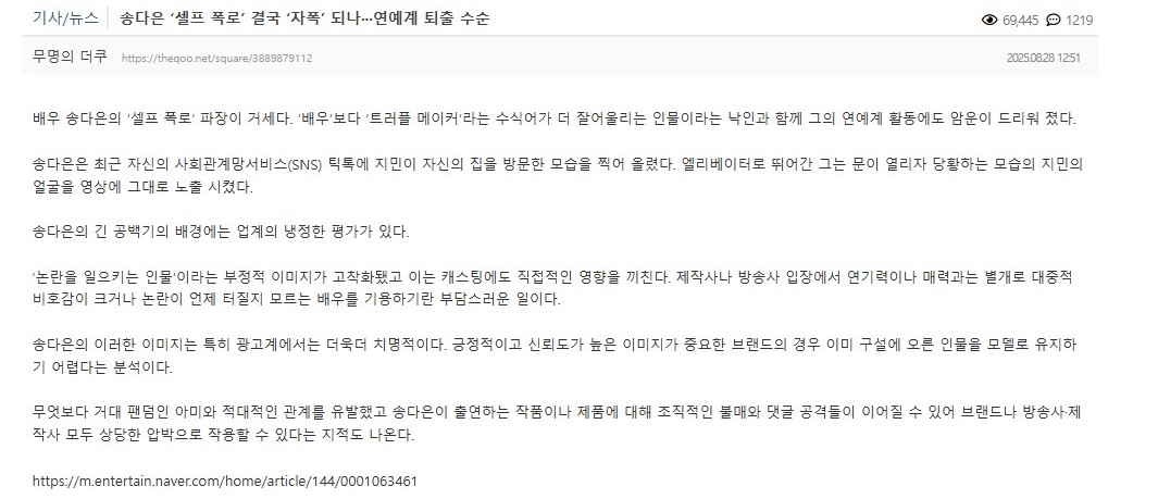 韓媒《體育京鄉》則形容宋多恩的「戀情自爆」反成「自毀」,可能成為她演藝事業的致命一擊。報導指出,宋多恩自 2022 年演出《金湯匙》後幾乎沒有新的代表作,反而因與 ARMY 的長期拉鋸戰而頻頻上新聞。